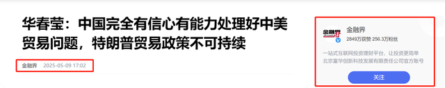 1.原文登载于金融界2025年05月09日关于“华春莹:中国完全有信心有能力处理好中美贸易问题,特朗普贸易政策不可持续”的报道