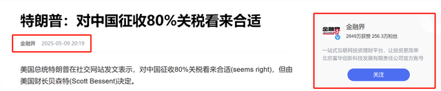 3.原文登载于金融界2025年05月09日关于“特朗普:对中国征收80%关税看来合适”的报道