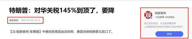 2.原文登载于观察者网2025年05月09日关于“特朗普:对华关税145%到顶了,要降”的报道
